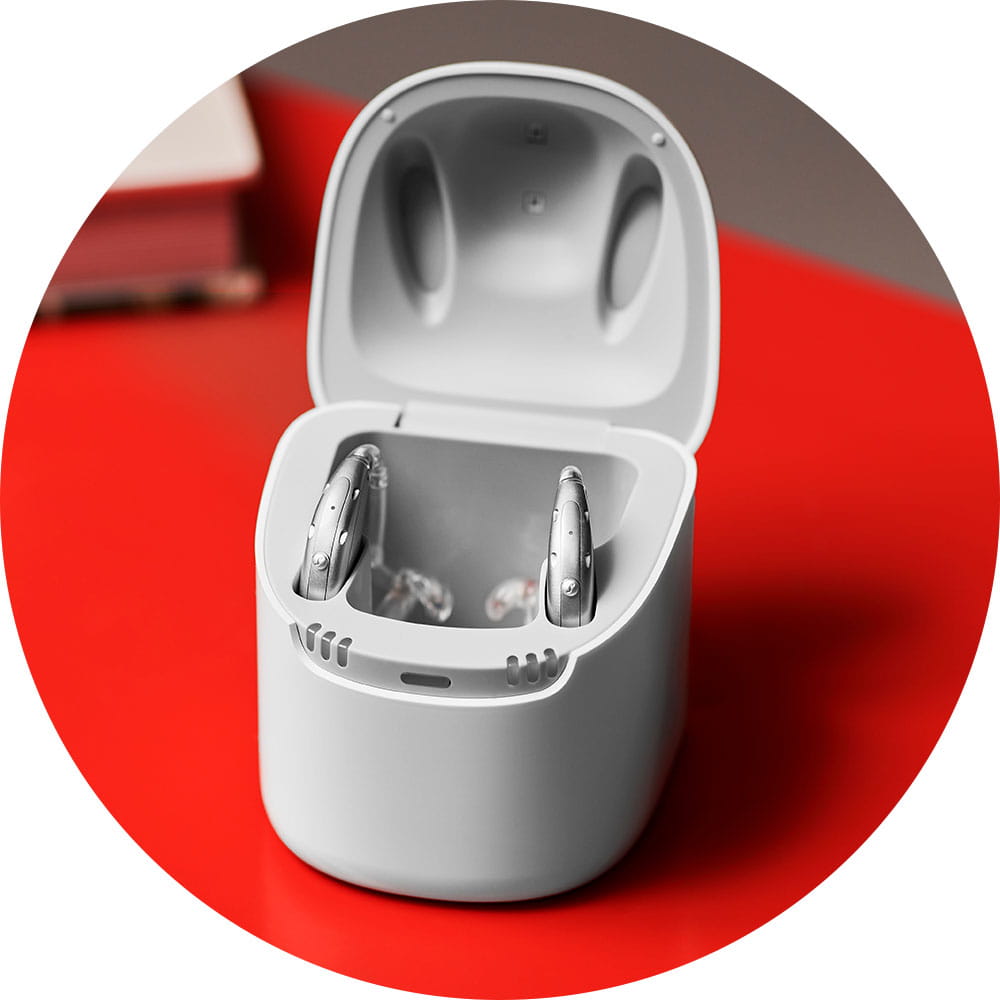 Pocket-sized charging case with integrated power bank that can provide up to three full charges before requiring a recharge. LEDs indicate the charging status of each hearing aid and the integrated power bank. Can be charged wirelessly (Qi).