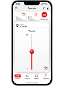 La nuova Modalità mascherina di Signia offre per la prima volta una soluzione dedicata a questo nuovo problema. È integrata nell'ultima versione della Signia app, sotto il programma di ascolto Universale e appare sullo schermo come un pulsante con l'icona di una mascherina, posta in alto a destra accanto al cursore del volume. È possibile attivare facilmente la Modalità mascherina toccando il pulsante, che cambia colore da grigio a rosso. Quando è in funzione, gli apparecchi acustici catturano in modo ottimale il suono dei segnali vocali in modo che le parole risultino più chiare e qualsiasi rumore di fondo sia ridotto per aiutare a capire ciò che viene detto. Per la prima volta, è possibile ridurre il suono smorzato senza dover togliere la mascherina!