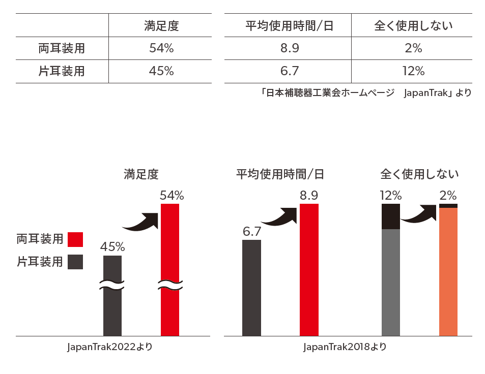 補聴器の効果を最大限発揮し、より快適で自然な聞こえを得るために両耳での装用をおすすめします。補聴器の両耳装用は満足度が高いという調査結果があります。