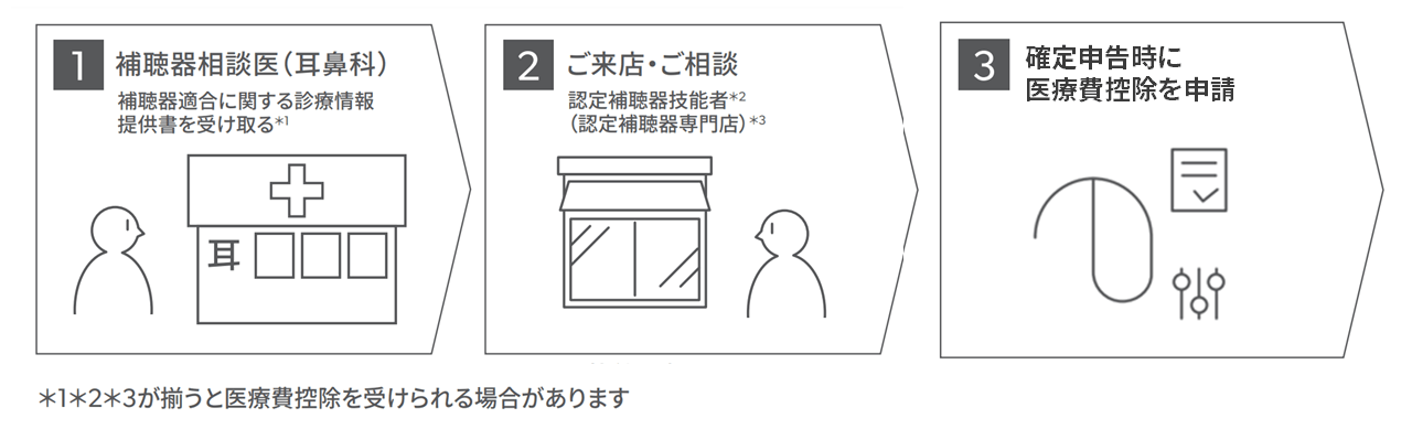「認定補聴器専門店」には「認定補聴器技能者」が在籍しています。認定補聴器専門店で認定補聴器技能者から補聴器を購入してください。それ以外の場所や人から補聴器を購入した場合には、医療費控除を受けることができません。診療情報提供書の控えと、補聴器の領収書を補聴器販売店から受け取ります。