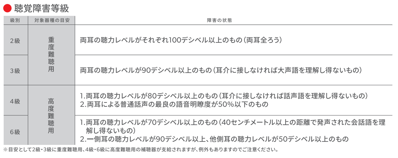 この制度を利用するためには、「聴覚障害等級」のいずれかの等級に該当することが条件となります。下記の図に示されている通り、高度難聴と重度難聴が対象になります。中等度や軽度の難聴者は対象にならないことが多く、支給を受けることが出来ませんのでご注意ください。