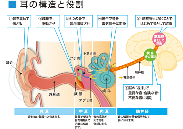 耳は音を拾い、耳あなを通して音を鼓膜へと伝えます。さらに内耳で音の振動は電気信号に変換され、聴神経によって脳へと伝達されます。