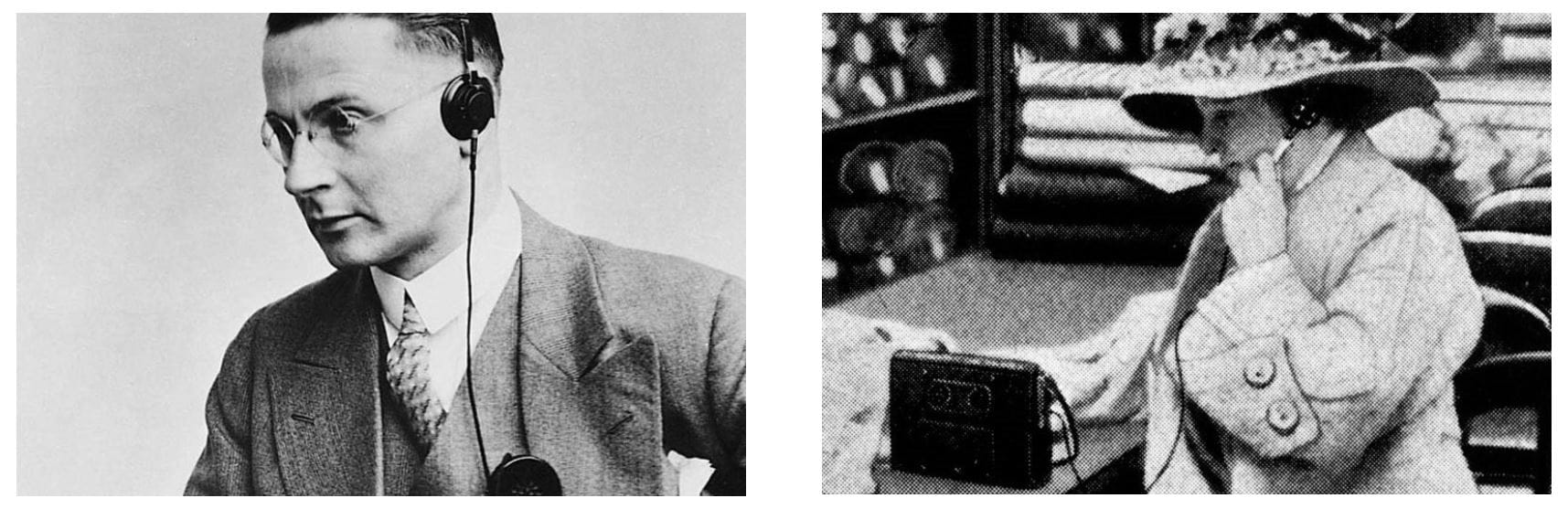 Esha Phonophorのレシーバー部分は、片耳用のヘッドセットの形をしていて、マイクは服のポケットに隠すことができます。補聴器の原型ともいえるこの補聴デバイスは需要が大きく、1913年に量産されました。同じシリーズで、女性でも持ちやすいようにカバンの形にしたものもあります。Esha Phonophorの成功で、シーメンスは補聴器業界の先駆者となりました。