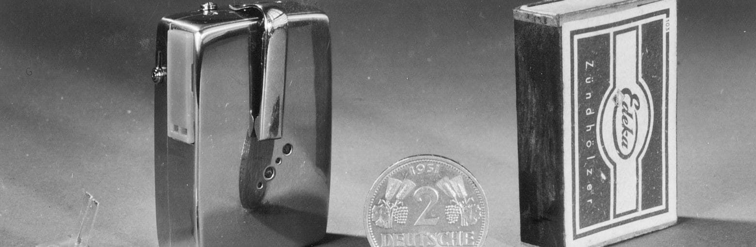 そのあとも補聴器の生産技術が進化し続け、1951年、真空管アンプを使ったポケットサイズの補聴器「Phonophor Alpha」が誕生しました。50 年代のポケットサイズ補聴器の大きさは当時のマッチ箱と同じくらいで、持ち運びがかなり便利になりました。