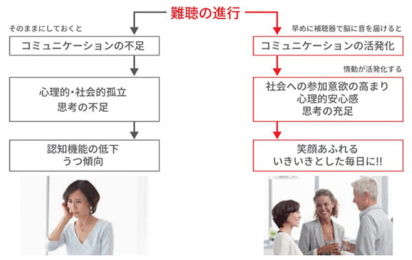 もちろん神経の可塑性のおかげで、難聴者は聴覚が低下しても、ある程度の症状までは対処できますが、その優れた機能のおかげで脳に有害な影響が出ることがあります。例えば聴覚が低下すると、「聴覚から得られる情報を理解し思考する」という、脳が本来持っている能力を活用しなくなり、劣化していきます。