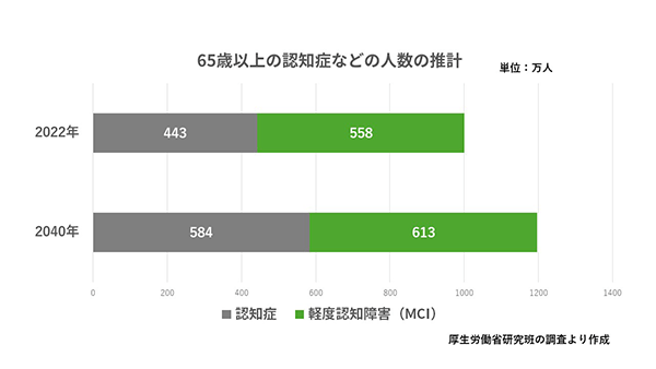 2024年5月8日に開催された「第2回認知症施策推進関係者会議」において、厚生労働省の研究班から認知症に関する最新調査結果が発表されました。日本の2040年時点の認知症者数が約584万人、軽度認知障害(MCI)※の人数が約613万人となると推計されています。高齢者のおよそ15%、6.7人に1人が認知症を発症し、軽度認知障害を含めるとさらに割合が増えますね。
