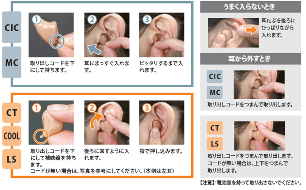 耳あな型補聴器の場合は、左右を間違えないようにするのはもちろん、上下も間違えないようにしましょう。取り出しコードがある場合は、コードが付いている方が下、と覚えると良いでしょう。オーダーメイド補聴器の場合は、耳にピッタリ沿うまでしっかり奥に入れます。耳たぶを後ろに引っ張りながら入れると上手く入ります。