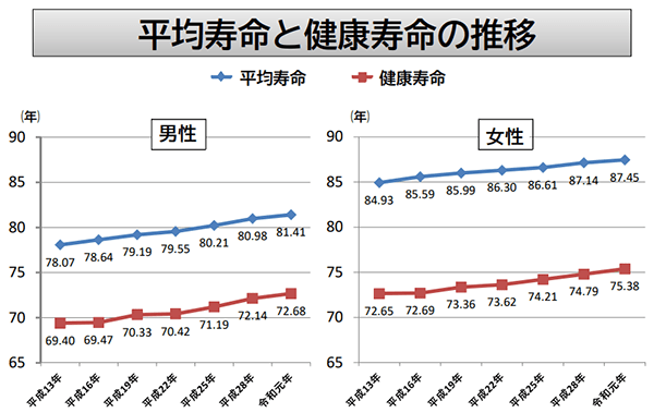 「健康寿命」とはWHOが提唱した新しい指標で、「健康上の問題で日常生活が制限されることなく生活できる期間」と定義されています。具体的には、寝たきりや認知症など介護が必要な期間を、平均寿命から差し引いた期間を指します。