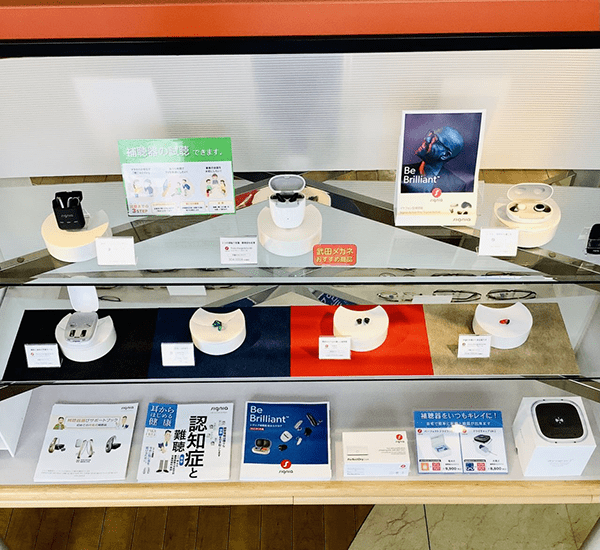 2. 補聴器の実機やダミーが綺麗に配置され、思わず手に取りたくなるようなレイアウト