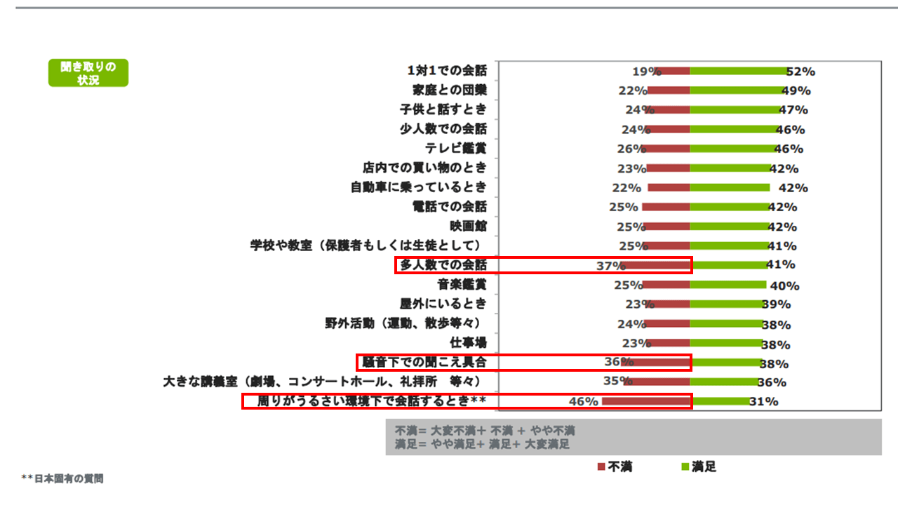 2022年日本補聴器工業会で実施した調査(JapanTrak2022)では、補聴器使用者の聞き取りに対する不満が多い項目として「多人数の会話」、「騒音下の聞こえ具合」、「周りがうるさい環境下での会話」が上位に来ています。