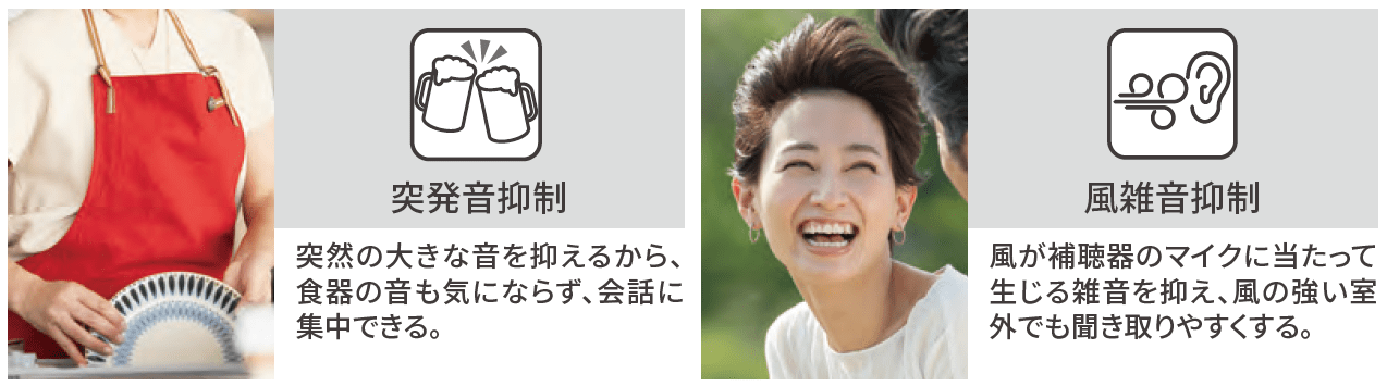 こんなシーンに対応できるように、補聴器には専用の機能が搭載されています。突然発生する大きな音に素早く反応し、音量を押さえてくれる「突発音抑制機能」です。