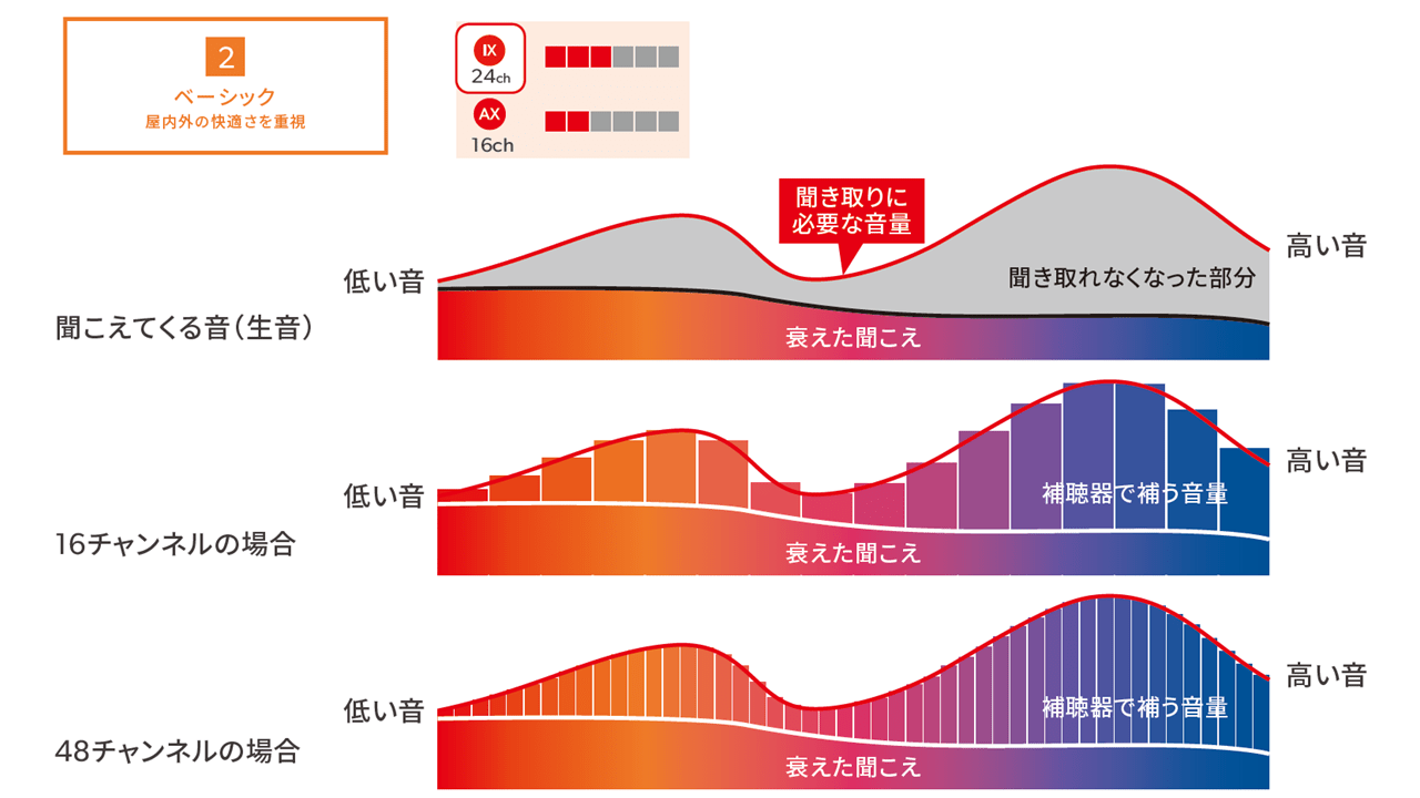 聴力は人それぞれなので、聞こえにくくなる音も異なります。補聴器は個々の聴力に合わせて、足りない音を増幅します。音の調整を細かくブロックに分けるほど、その人の聴力に合わせた適切な音の処理ができるようになります。