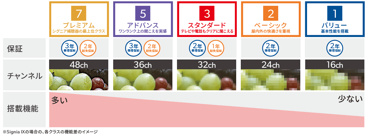 シグニア補聴器は、性能と搭載機能の違いにより下記5つのクラスに分かれています。