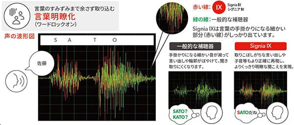 Signia IXシリーズはこの図のように、取りこぼしがちな言い出しや子音等(赤い線)もより正確に再現し、よりくっきり明瞭な聞こえを実現します。