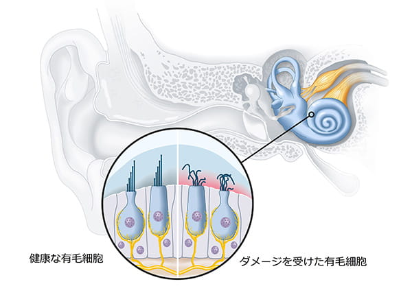 自然なことですが、人間が年を取るとともに、蝸牛の中の有毛細胞も老化していきます。蝸牛の入り口付近の有毛細胞は高い音を、奥に進むにつれて低い音を感知しています。入口付近にある有毛細胞が一番ダメージを受けやすいため、一般的に高い音の感知機能が最初に低下します。加齢性難聴が通常高い音から聞こえにくくなるのはそのためです。