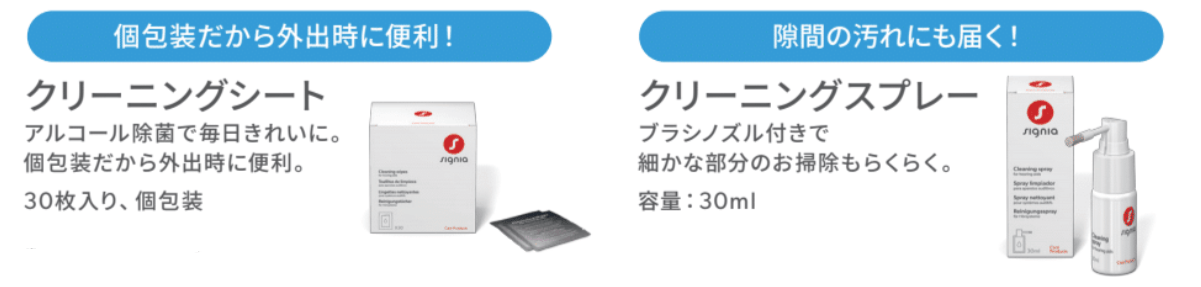 頑固な汚れ、補聴器表面の菌やウィルスが気になる場合、補聴器専用の「クリーニングシート」や、「クリーニングスプレー」の使用をお勧めします。乾いたティッシュや綿棒に、クリーニング液をごく少量つけて湿らせて、拭いてください。