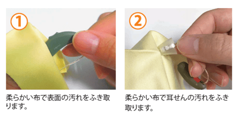 柔らかい布(メガネ拭き等)で補聴器の本体と耳せんを優しくふき取ります。