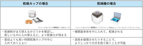 次に、よりしっかりと水分を除去するために、補聴器を乾燥カップあるいは乾燥機に入れます。それぞれの乾燥方法は下記の通りです。