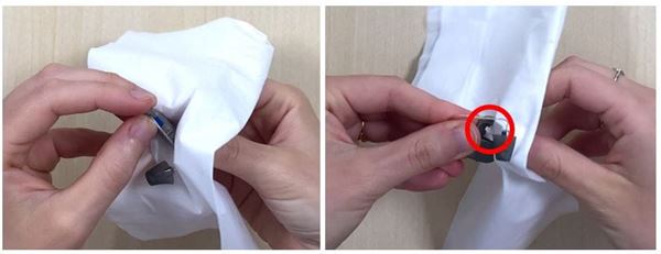 充電式補聴器のステップ1と同じく、外側の水分を完全に取り除いてから、電池室を開けて、電池を取り出します。電池室の中が濡れていたら、できる範囲で水分を拭き取りましょう。補聴器が壊れないよう、やさしく行いましょう。 電池も、水分をしっかりと拭き取ります。