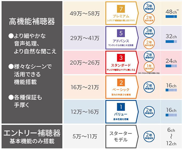 何が違うのでしょうか?補聴器の価格差は、補聴器の基本性能と、搭載されている機能の違いから出ています。