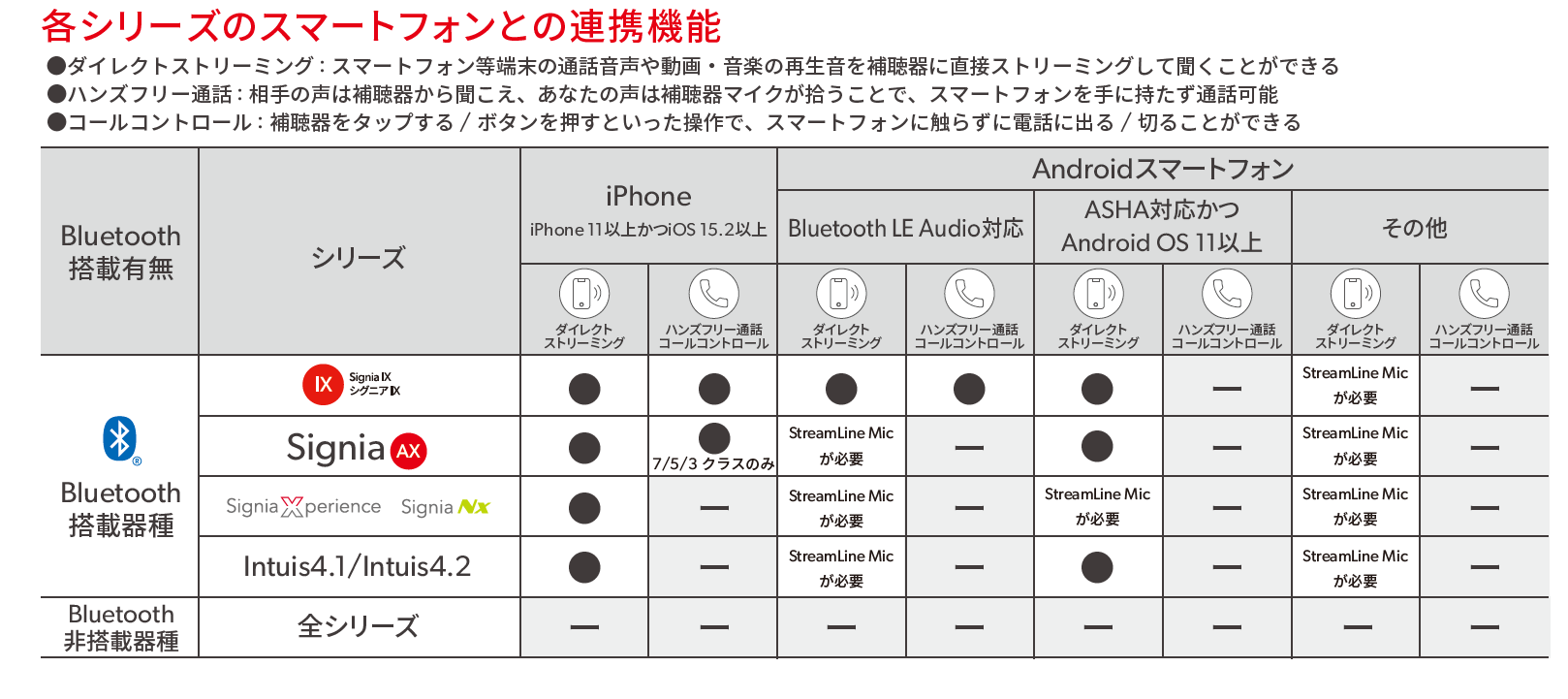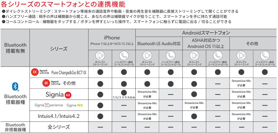 以下のASHA機能搭載スマートフォンはSignia IXおよびSignia AXシリーズのBluetooth補聴器と互換性があります。