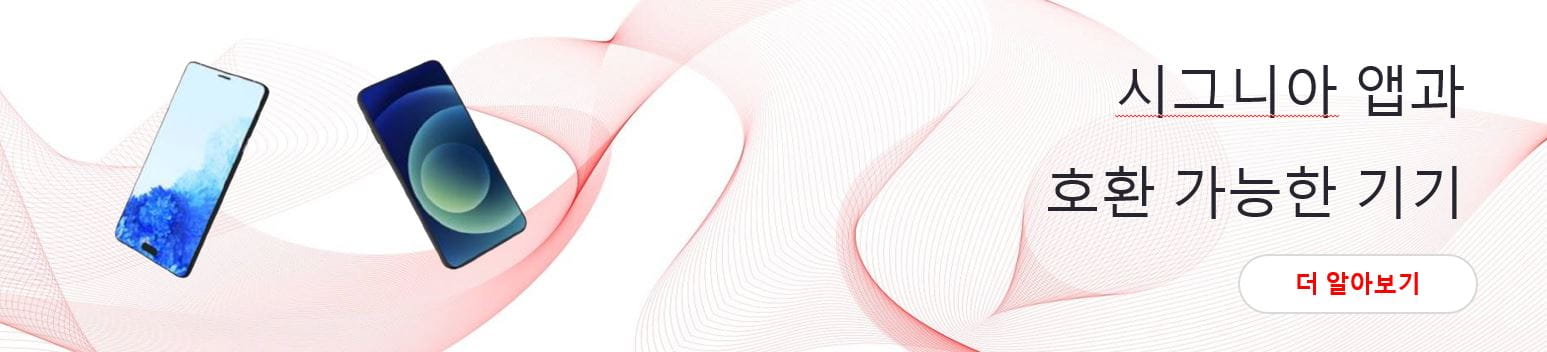 시그니아 앱은 대부분의 안드로이드 기기(안드로이드 5.0 이상), 애플 기기(iOS 9.3 이상)와 호환됩니다. 안드로이드 기기의 경우, 최적화 상태로 앱을 사용할 수 있는 추천 안드로이드 기기 목록이 ‘시그니아 앱 웹사이트’에 기재되어 있습니다.